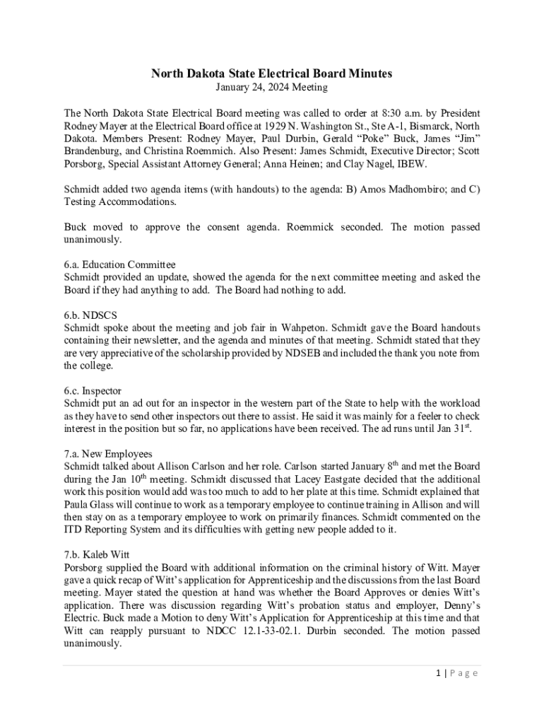 January 24, 2024, Meeting North Dakota State Electrical Board meeting was called to order at 8:30 a.m. by President