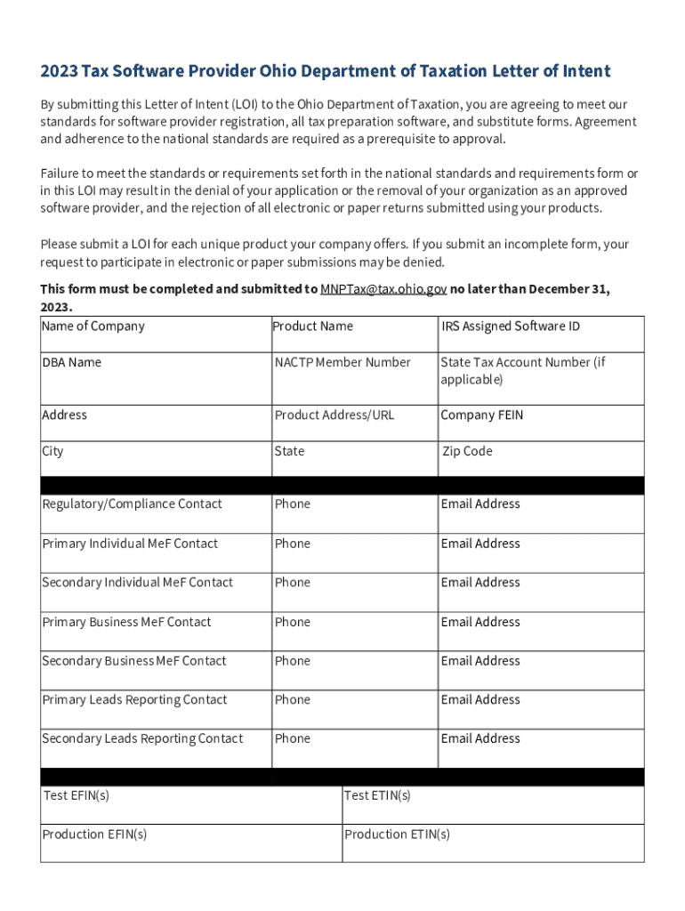 Modernized file Municipal Net Profit Tax Letter of Intent Tax Year 2023Letter of Intent must be submitted to the Ohio Department of Taxation by December 31, 2023MNP MEF group MNPTax@tax.ohio.gov 161472815412023