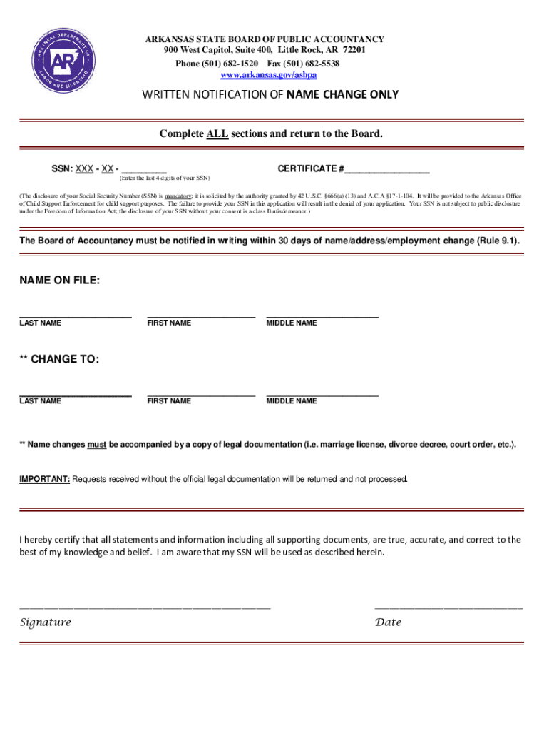 ARKANSAS STATE BOARD OF PUBLIC ACCOUNTANCY 900 West Capitol, Suite 400, Little Rock, AR 72201 Phone (501) 6821520 Fax (501) 6825538 www.arkansas.gov/asbpaWRITTEN NOTIFICATION OF NAME CHANGE ONLY Complete