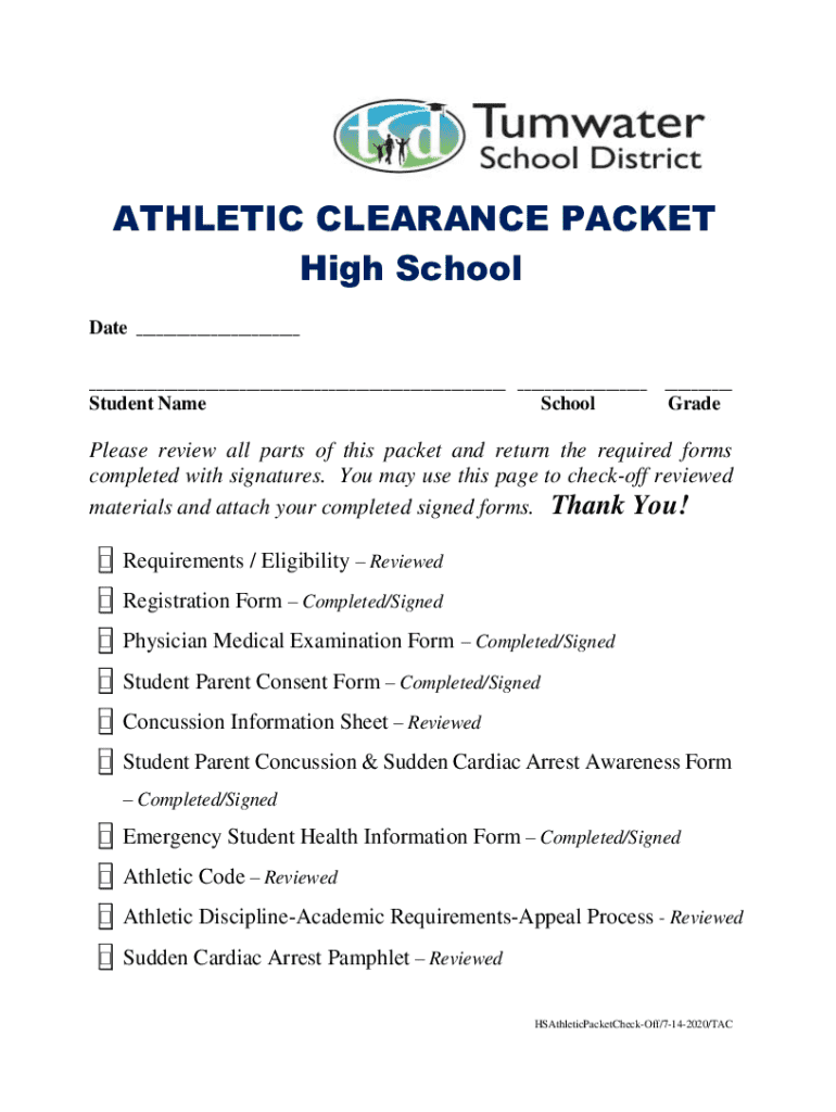 Date______ ______Student NameGradeSchoolPlease review all parts of this packet and return the required forms