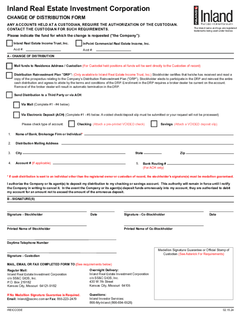 Inland Real Estate Investment Corporation CHANGE OF DISTRIBUTION FORM ANY ACCOUNTS HELD AT A CUSTODIAN, REQUIRE THE AUTHORIZATION OF THE CUSTODIAN. CONTACT THE CUSTODIAN FOR SUCH REQUIREMENTS. The