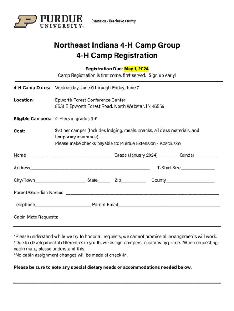 Get the free 4-H Camp Registration - Purdue Extension - extension purdue
