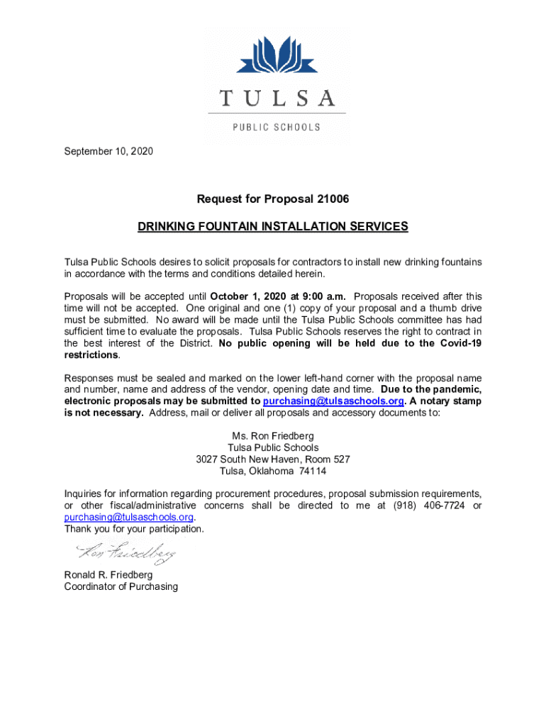 September 10, 2020Request for Proposal 21006 DRINKING FOUNTAIN INSTALLATION SERVICES Tulsa Public Schools desires to solicit proposals for contractors to install new drinking fountains in accordance