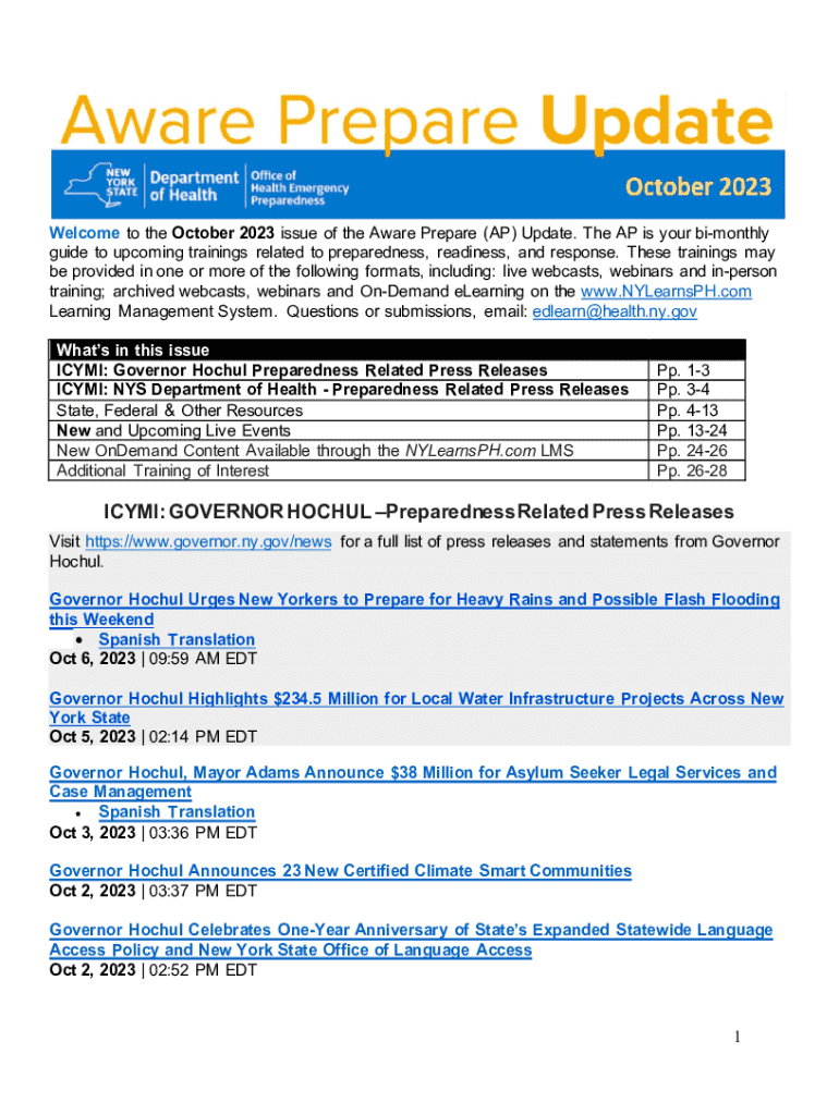 Welcome to the October 2023 issue of the Aware Prepare (AP) Update. The AP is your bimonthly guide to upcoming trainings related to preparedness, readiness, and response. These trainings may be provided