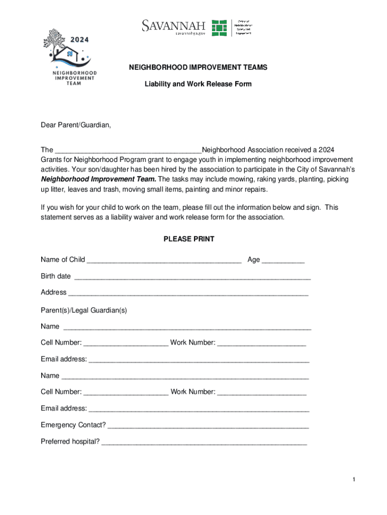Get the free NEIGHBORHOOD IMPROVEMENT TEAMS Liability and Work ...