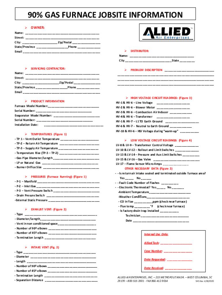 90% GAS FURNACE JOBSITE INFORMATION OWNER: Name: ___ Street: ___ City: ___ Zip/Postal ___ State/Province ___Phone ___ Email ___ SERVICING CONTRACTOR: Name: ___ Street: ___ City: ___ Zip/Postal ___
