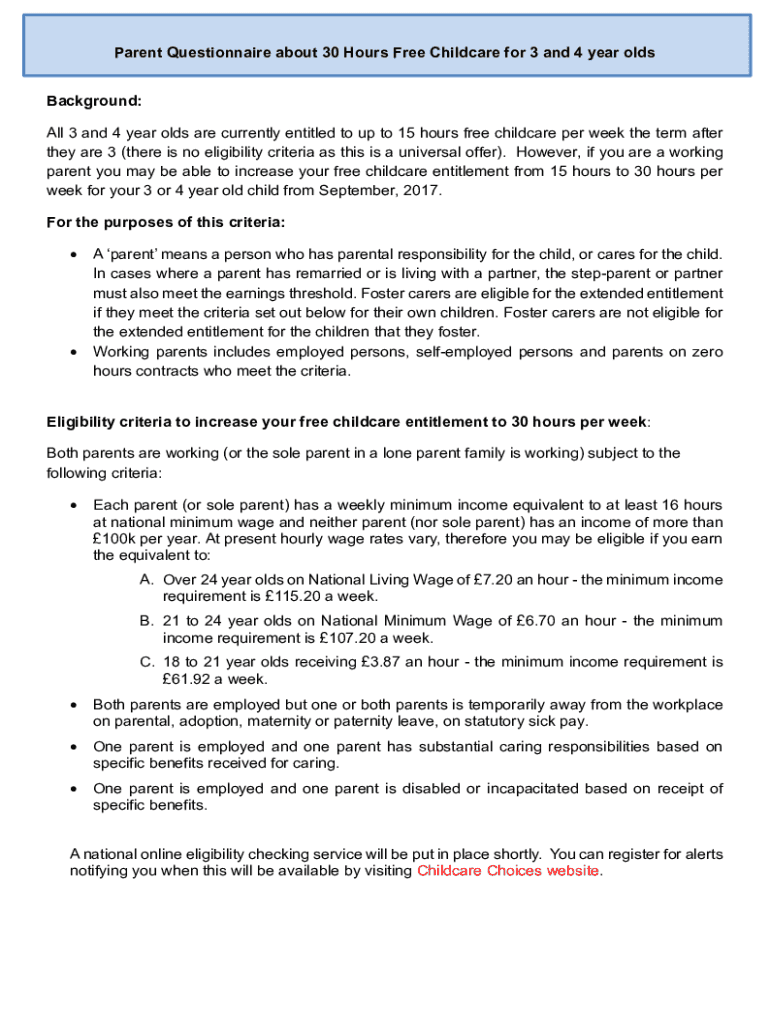 Parent Questionnaire about 30 Hours Free Childcare for 3 and 4-year-olds Background: All 3 and 4-year-olds are currently entitled to up to 15 hours free childcare per week the term after they are