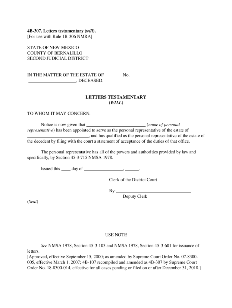 4B307. Letters testamentary (will). [For use with Rule 1B306 NMRA] STATE OF NEW MEXICO COUNTY OF BERNALILLO SECOND JUDICIAL DISTRICT IN THE MATTER OF THE ESTATE OF ___, DECEASED. No. ___LETTERS TESTAMENTARY