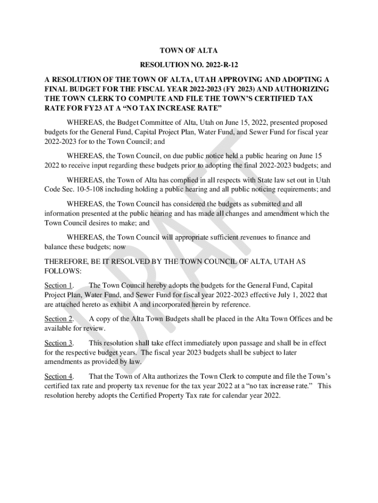 TOWN OF ALTA RESOLUTION NO. 2022R12 A RESOLUTION OF THE TOWN OF ALTA, UTAH APPROVING AND ADOPTING A FINAL BUDGET FOR THE FISCAL YEAR 20222023 (FY 2023) AND AUTHORIZING THE TOWN CLERK TO COMPUTE AND