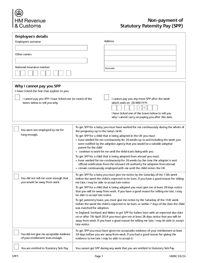 Get the free Non-payment of Statutory Paternity Pay (SPP). Statutory Paternity Pay