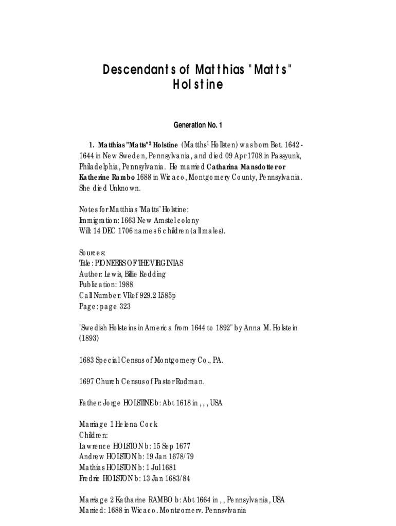 Generation No. 11. Matthias \”Matt's\” 2 Hols tine (Matths1 Holstein) was born Bet. 1642 1644 in New Sweden, Pennsylvania, and died 09 Apr 1708