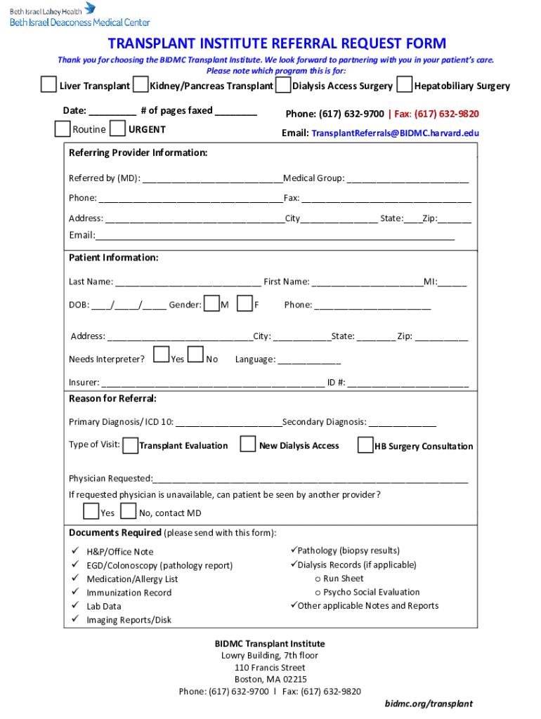 To fill out the bidmc transplant referral intake, providers should complete the designated referral form with patient details, medical history, and relevant clinical findings.