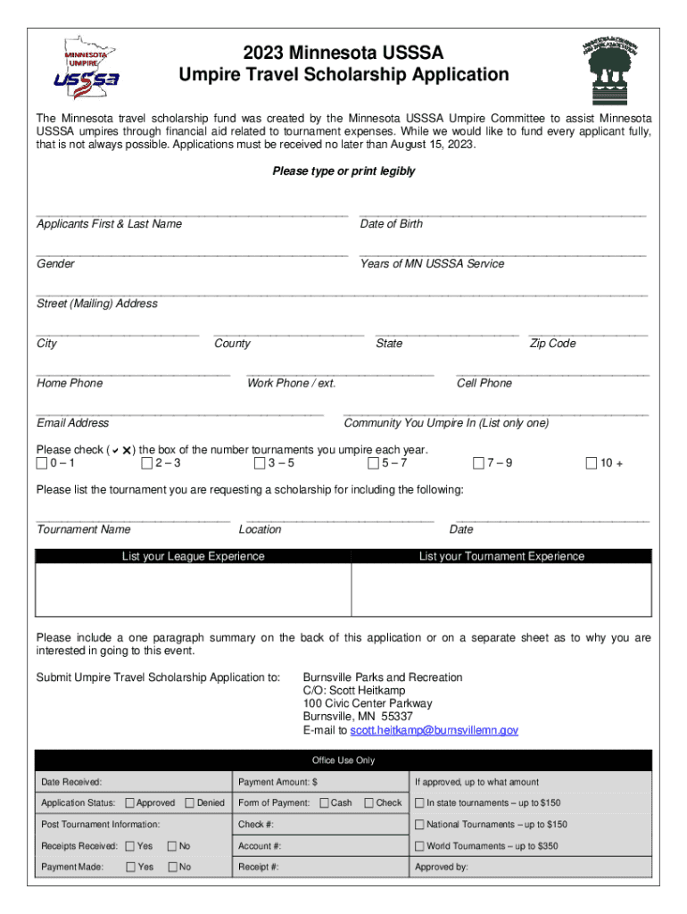2023 Minnesota US SSA Umpire Travel Scholarship Application The Minnesota travel scholarship fund was created by the Minnesota US SSA Umpire Committee to assist Minnesota US SSA umpires through financial