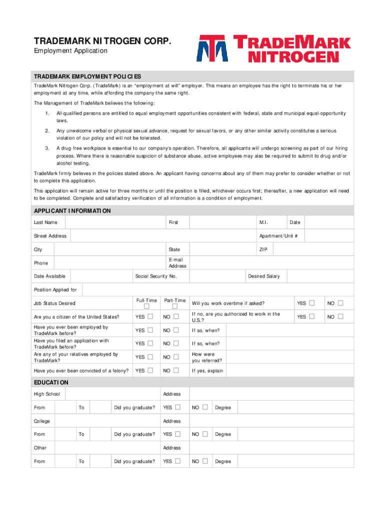 TRADEMARK NITROGEN CORP. Employment ApplicationTRADEMARK EMPLOYMENT POLICIES TradeMark Nitrogen Corp. (TradeMark) is an employment at will employer. This means an employee has the right to terminate