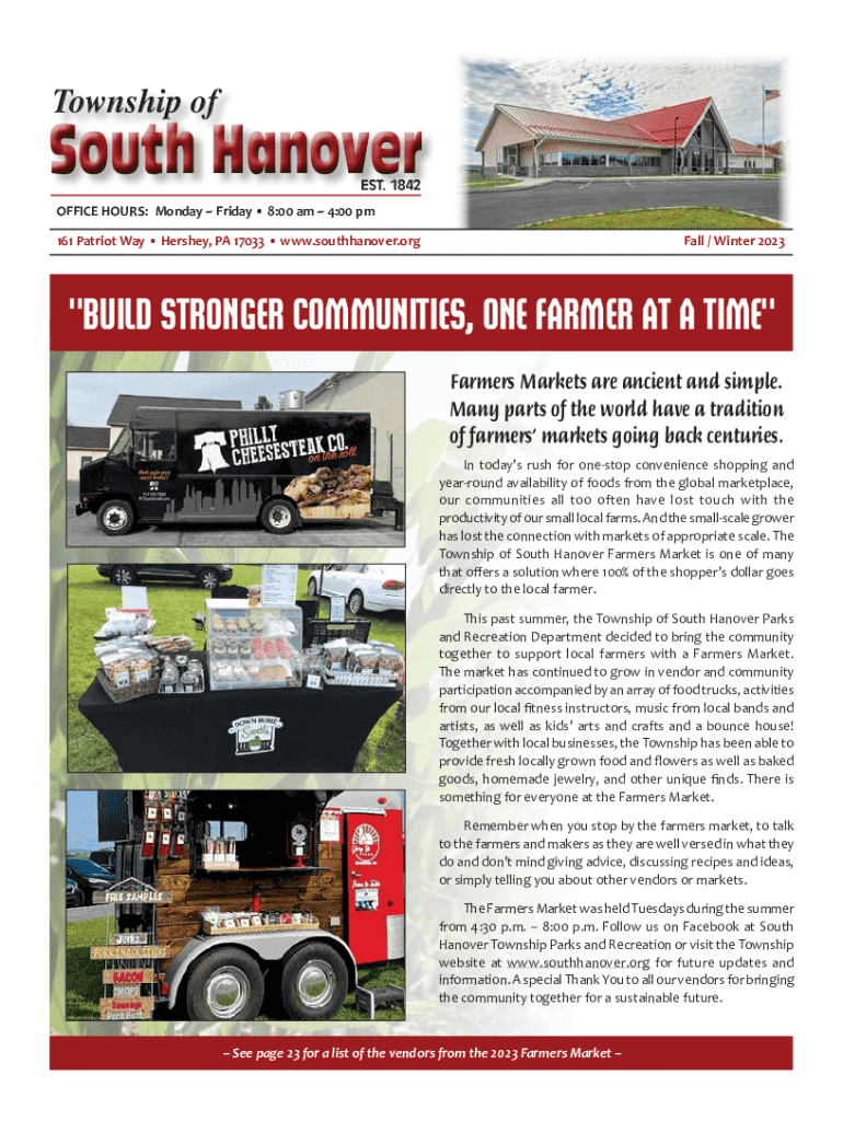 South Hanover EST. 1842 OFFICE HOURS: Monday Friday 8:00 am 4:00 pm 161 Patriot Way Hershey, PA 17033 www.southhanover.orgFall / Winter 2023\”BUILD STRONGER COMMUNITIES, ONE FARMER AT A TIME\”