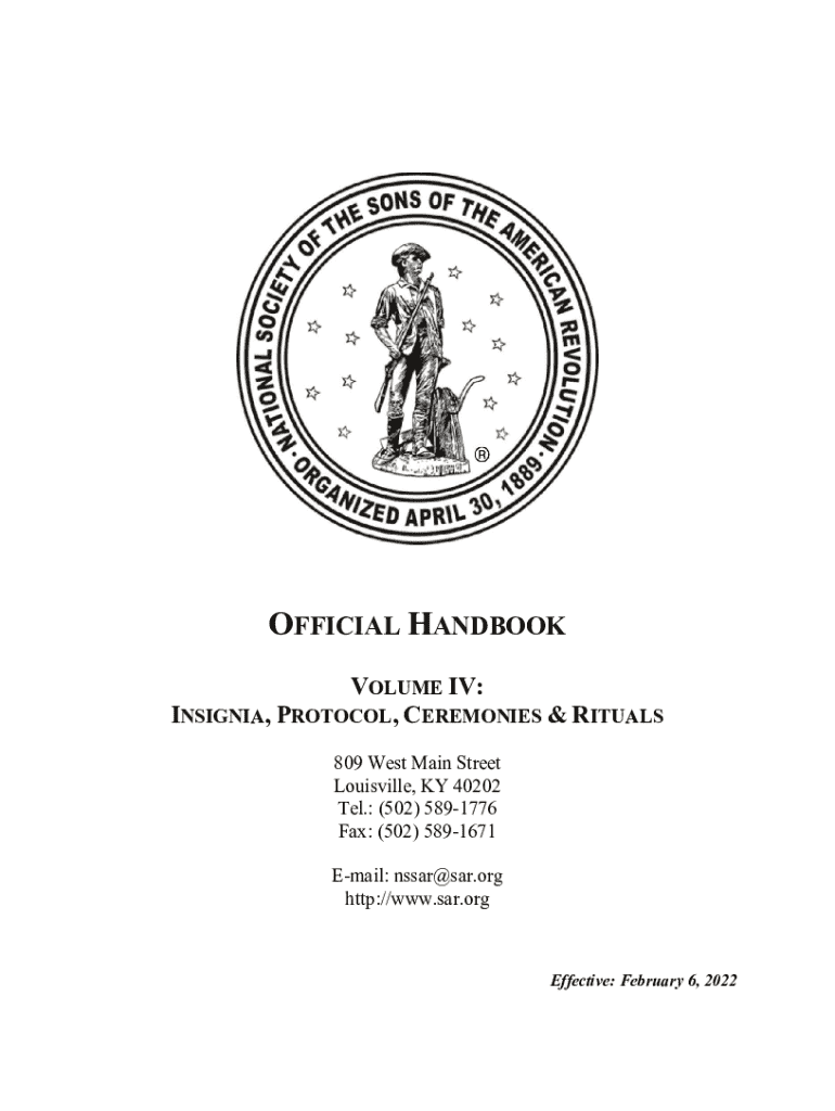 OFFICIAL HANDBOOK VOLUME IV: INSIGNIA, PROTOCOL, CEREMONIES & RITUALS 809 West Main Street Louisville, KY 40202 Tel.: (502) 5891776 Fax: (502) 5891671 Email: nssar@sar.org http://www.sar.orgEffective: