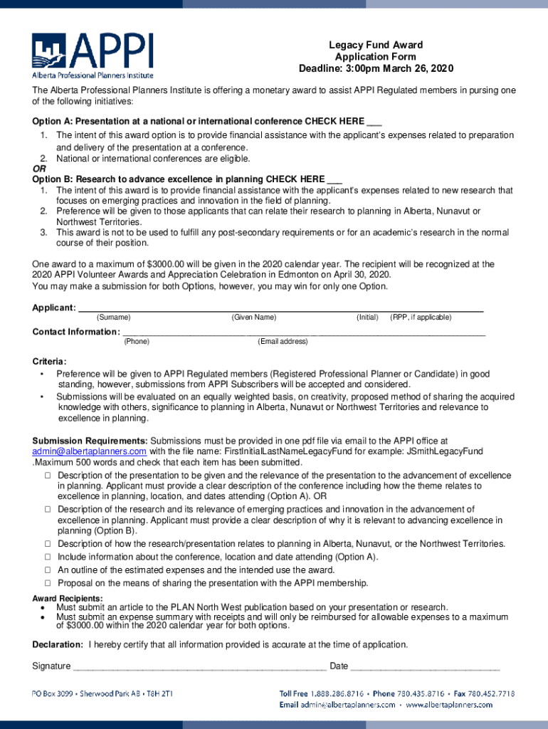 Legacy Fund Award Application Form Deadline: 3:00pm March 26, 2020, The Alberta Professional Planners Institute is offering a monetary award to assist PPI Regulated members in pursing one of the following