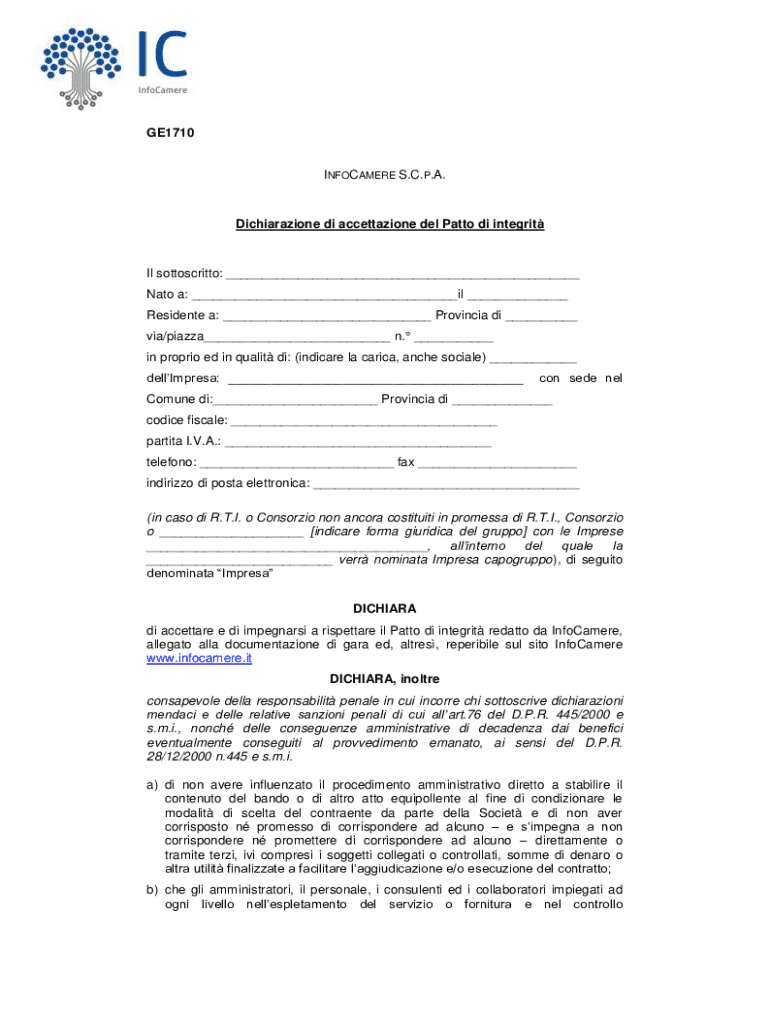 GE1710INFOCAMERE S.C.P.A.Dichiarazione di accettazione del Patto di integritIl sottoscritto: ___ Nato a: ___il ___ Residente a: ___ Provincia di ___ via/piazza___ n. ___ in proprio ed in qualit di: