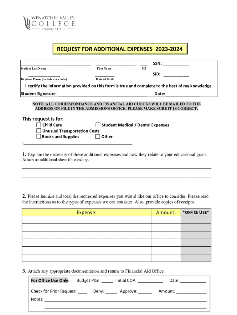 REQUEST FOR ADDITIONAL EXPENSES 20232024 If you incur expenses during the current school year that will exceed the standard budget used by our office, you may complete and return the request form