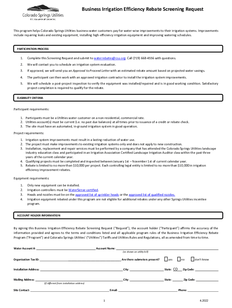 Business Irrigation Efficiency Rebate Screening RequestThis program helps Colorado Springs Utilities business water customers pay for waterwise improvements to their irrigation systems. Improvements
