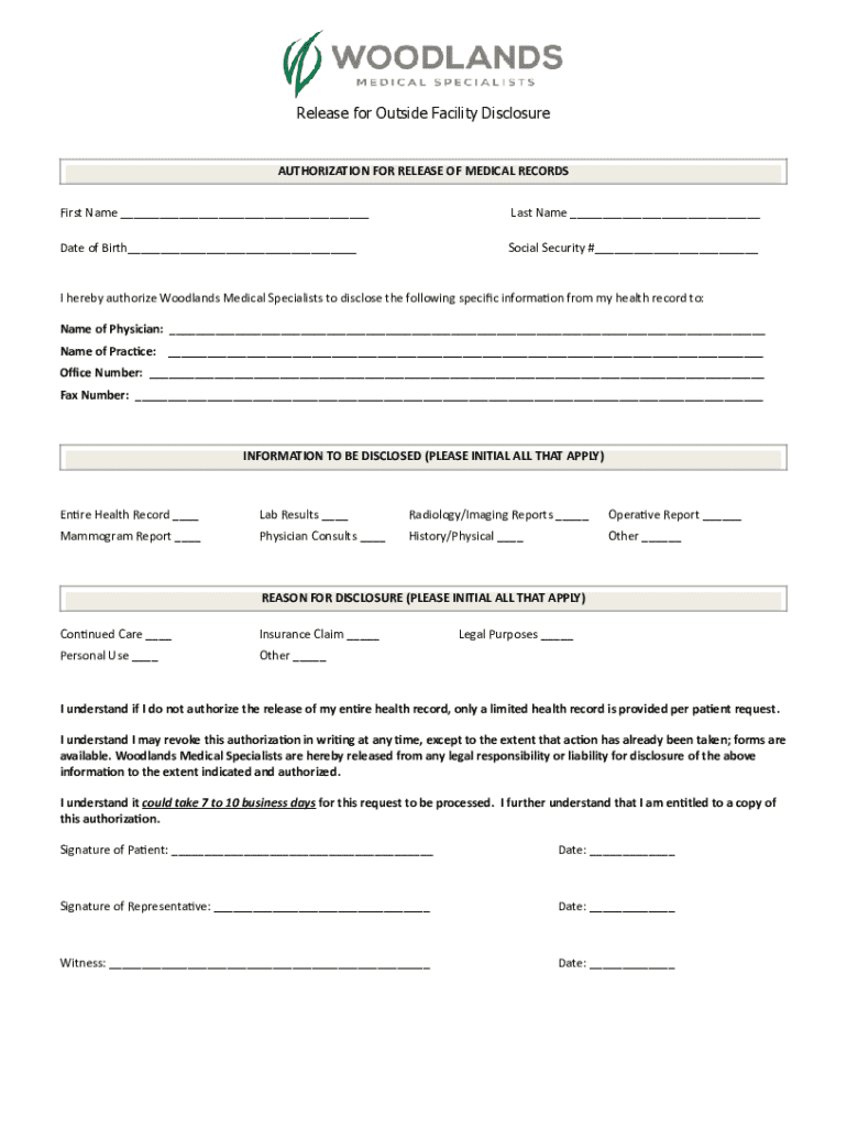 Get the free I hereby authorize Woodlands Medical Specialists to disclose the following speci c i...