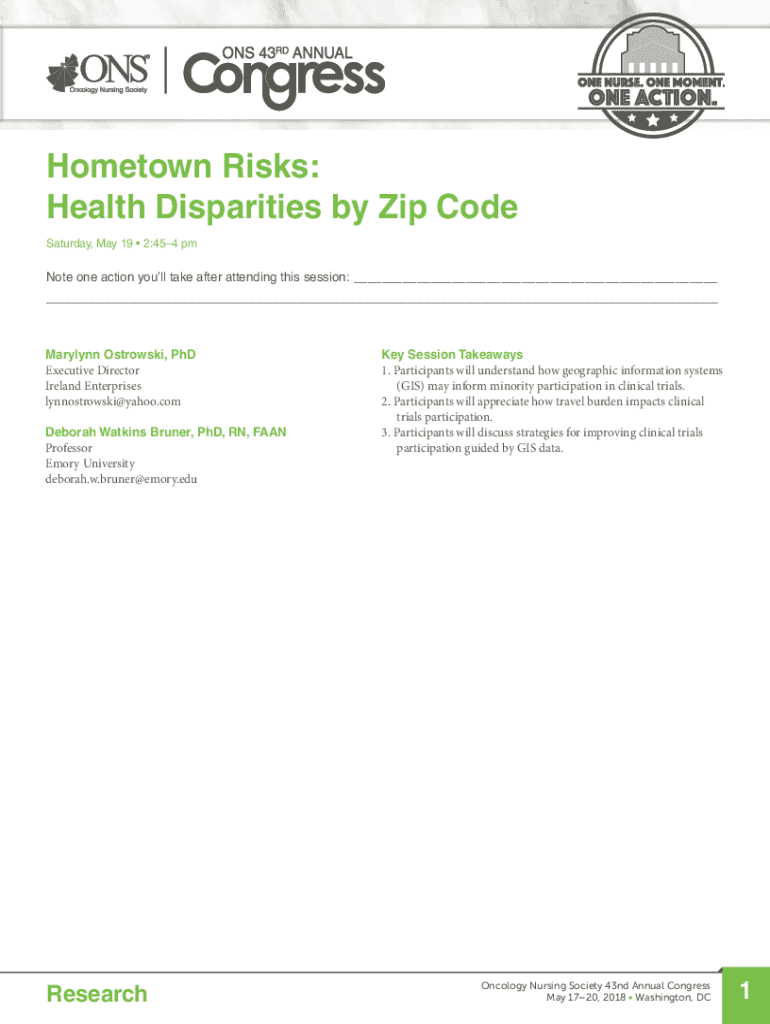 Hometown Risks: Health Disparities by Zip Code Saturday, May 19 2:454 note one action you'll take after attending this session: ______Maryland Ostrowski, PhD Executive Director Ireland Enterprises