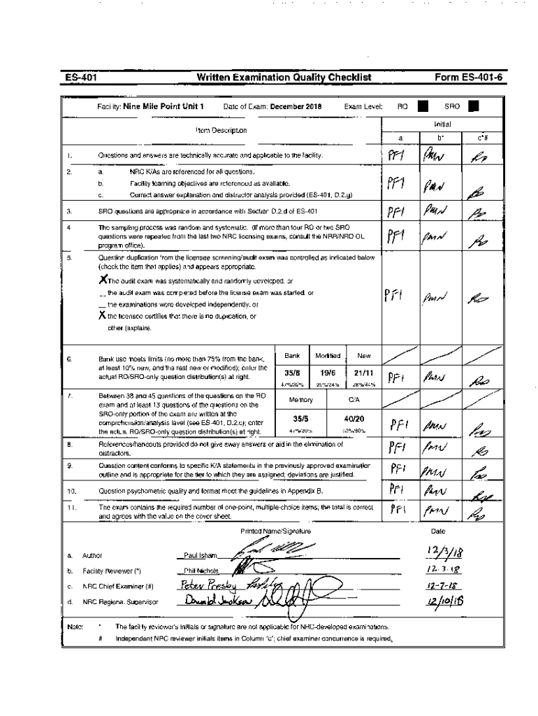 ES401Form ES4016Written Examination Quality Checklist Facility:Nine Mile Point Unit 1Date of Exam: December 2018ROExam Level: SROInitialItem Description1. Questions and answers are technically accurate