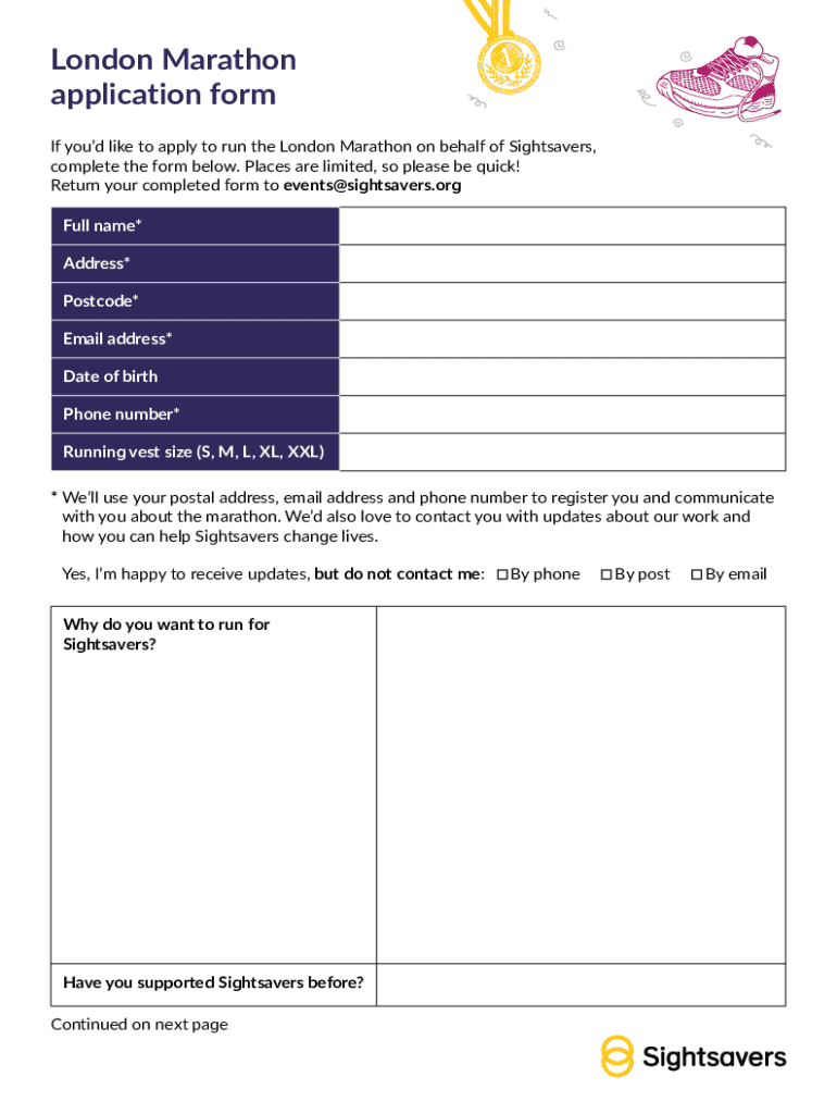 London Marathon application form If you'd like to apply to run the London Marathon on behalf of Sight savers, complete the form below. Places are limited, so please be quick! Return your completed