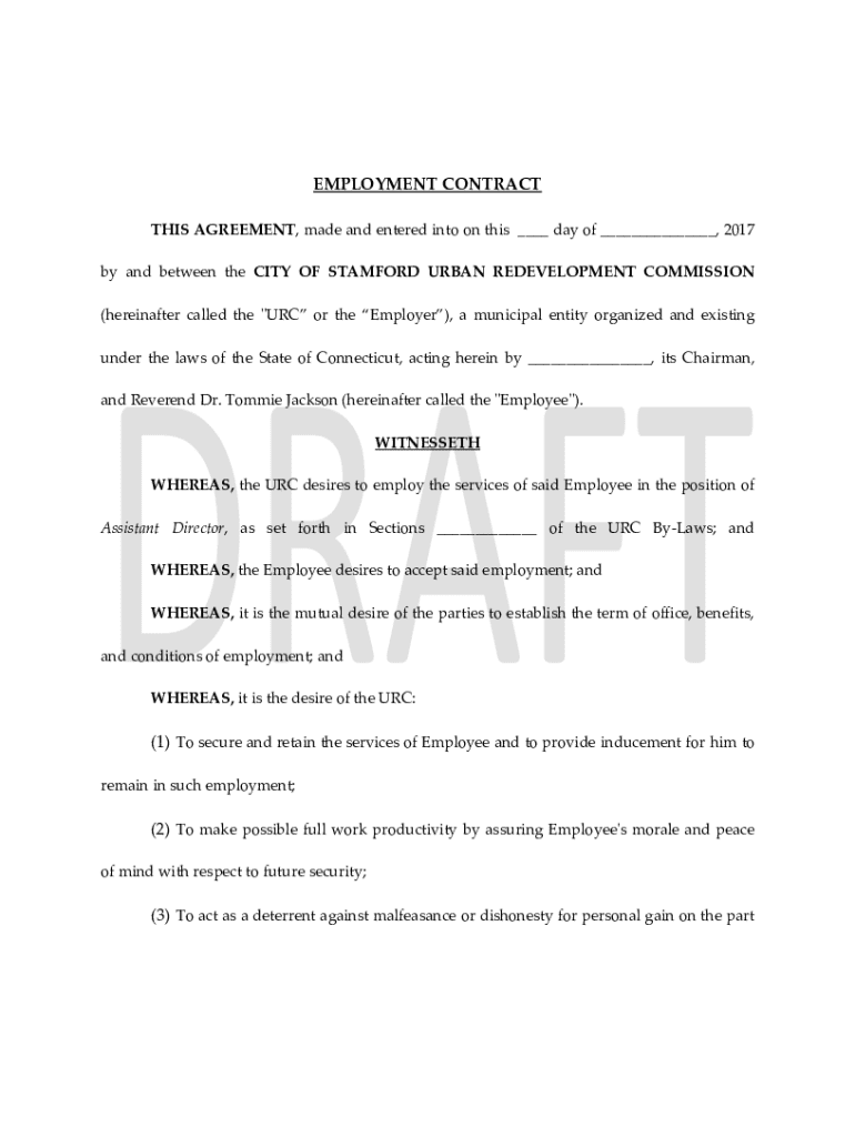 EMPLOYMENT CONTRACT THIS AGREEMENT, made and entered into on this ___ day of ___, 2017 by and between the CITY OF STAMFORD URBAN REDEVELOPMENT COMMISSION (hereinafter called the \”ARC or the Employer),