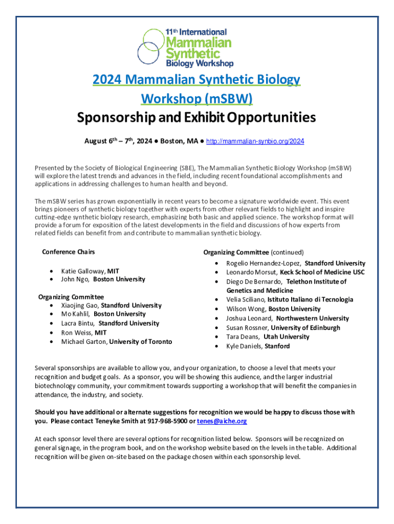 2024 Mammalian Synthetic Biology Workshop (MSW)Sponsorship and Exhibit Opportunities August 6th 7th, 2024 Boston, MA http://mammaliansynbio.org/2024 Presented by the Society of Biological Engineering