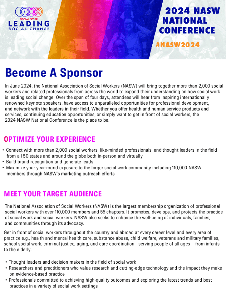 Become A Sponsor In June 2024, the National Association of Social Workers (NASW) will bring together more than 2,000 social workers and related professionals from across the world to expand their