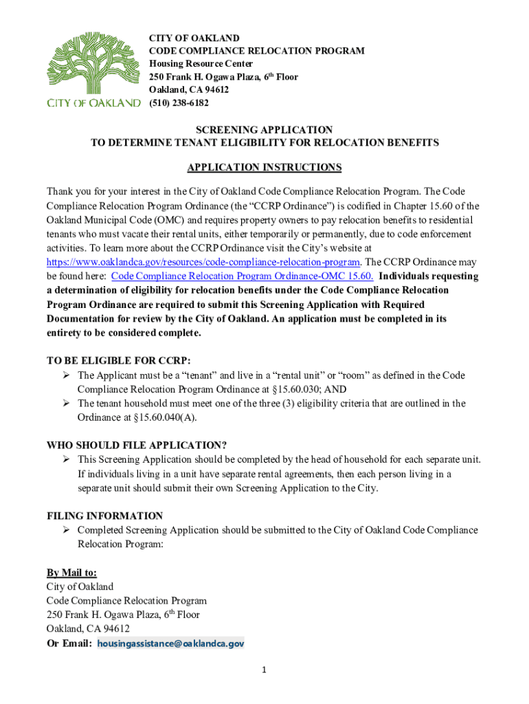 CITY OF OAKLAND CODE COMPLIANCE RELOCATION PROGRAM Housing Resource Center 250 Frank H. Ottawa Plaza, 6th Floor Oakland, CA 94612 (510) 2386182SCREENING APPLICATION TO DETERMINE TENANT ELIGIBILITY