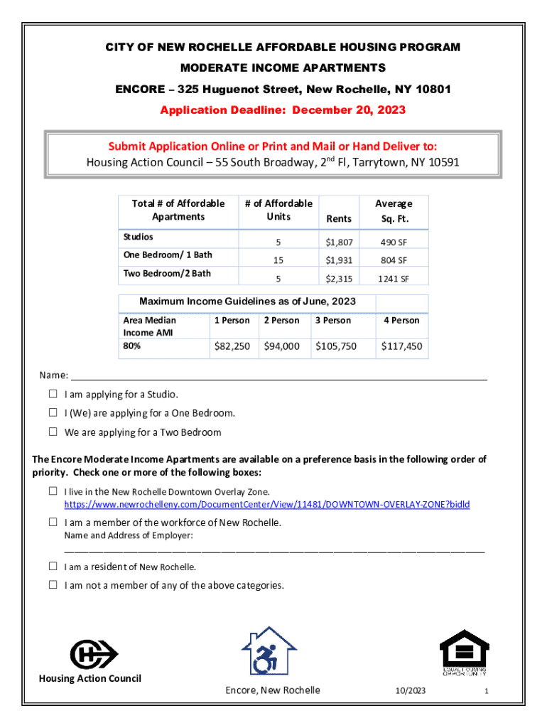 CITY OF NEW ROCHELLE AFFORDABLE HOUSING PROGRAM MODERATE INCOME APARTMENTS ENCORE 325 Huguenot Street, New Rochelle, NY 10801 Application Deadline: December 20, 2023Submit Application Online or Print