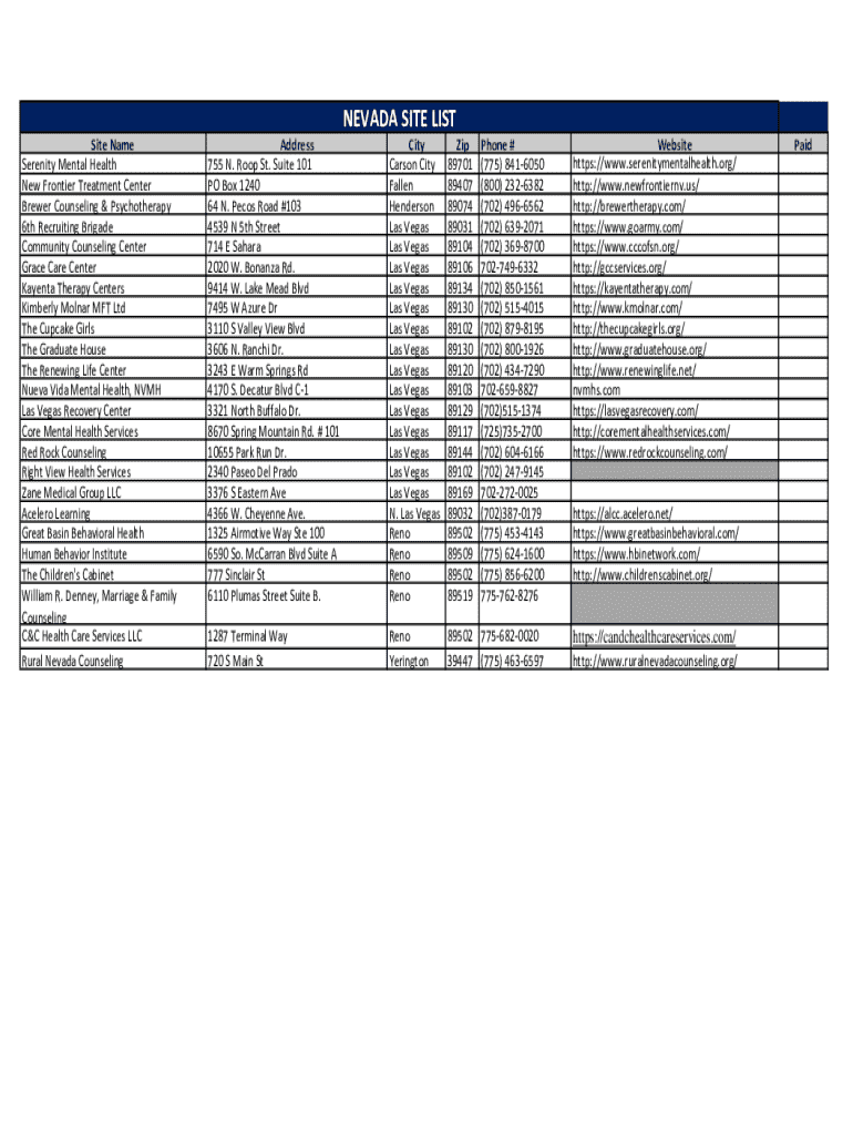 NEVADA SITE LIST Site Name Serenity Mental Health New Frontier Treatment Center Brewer Counseling & Psychotherapy 6th Recruiting Brigade Community Counseling Center Grace Care Center Kayenta Therapy