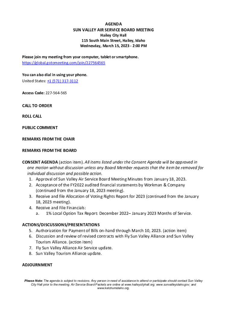 SUN VALLEY AIR SERVICE BOARD MEETING