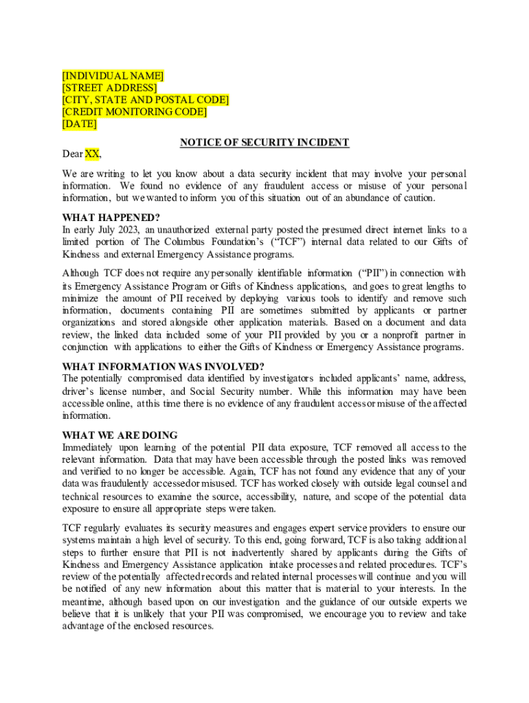 [INDIVIDUAL NAME] [STREET ADDRESS] [CITY, STATE AND POSTAL CODE] [CREDIT MONITORING CODE] [DATE] Dear XX,NOTICE OF SECURITY INCIDENTWe are writing to let you know about a data security incident that