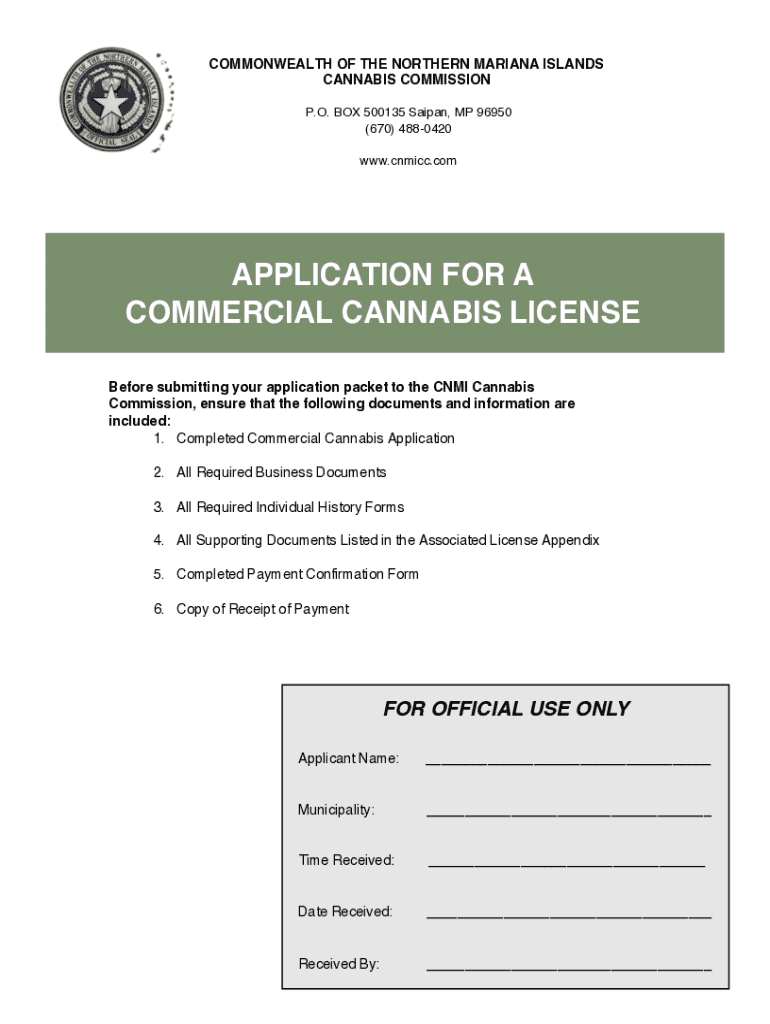 COMMONWEALTH OF THE NORTHERN MARIANA ISLANDS CANNABIS COMMISSION P.O. BOX 500135 Saipan, MP 96950 (670) 4880420 www.cnmicc.comAPPLICATION FOR A COMMERCIAL CANNABIS LICENSE Before submitting your application