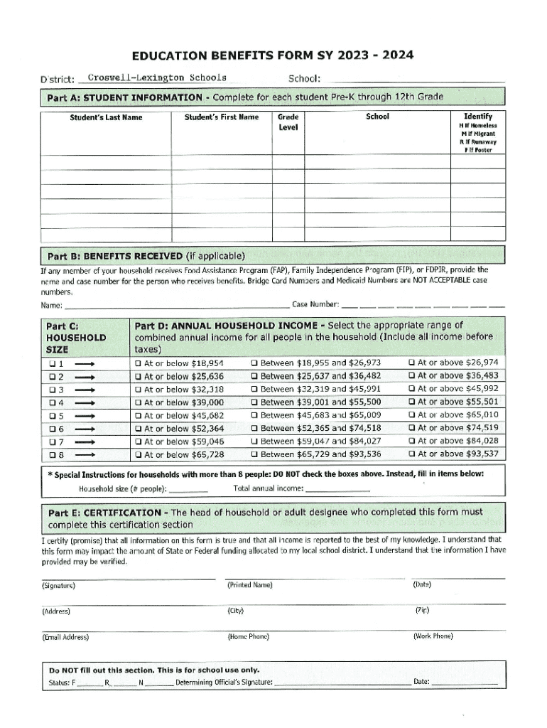 Part A: STUDENTFORMSchoolsINFORMATIONStudents Last NameBENEFITSSY 2023 2024School: Complete for eachStudent\'s First Name student Prey throughGrade