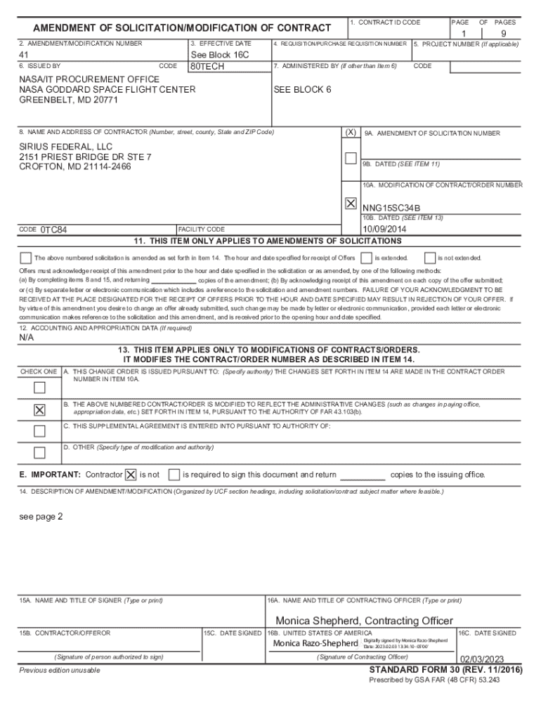 AMENDMENT OF SOLICITATION/MODIFICATION OF CONTRACT 2. AMENDMENT/MODIFICATION NUMBER41 6. ISSUED BYCODE1. CONTRACT ID CODEPAGEOFPAGES193. EFFECTIVE DATE4. REQUISITION/PURCHASE REQUISITION NUMBER5.