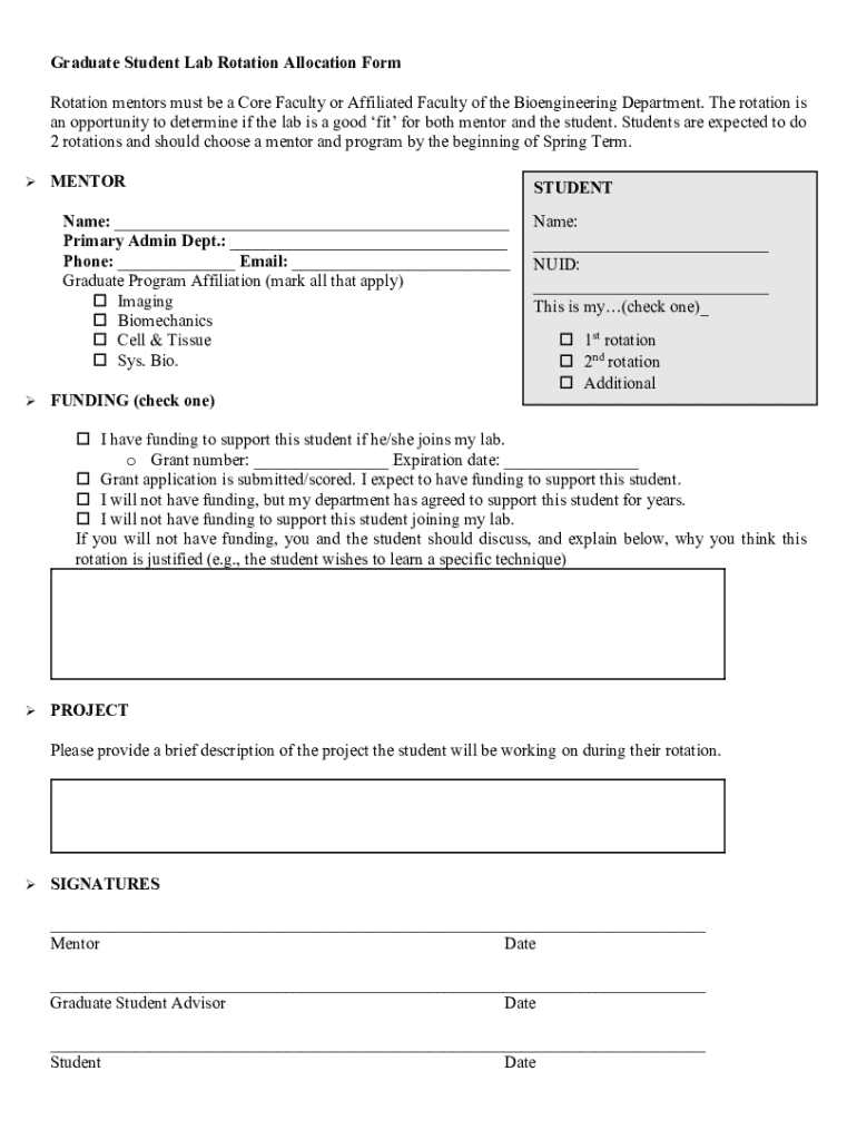 Graduate Student Lab Rotation Allocation Form Rotation mentors must be a Core Faculty or Affiliated Faculty of the Bioengineering Department. The rotation is an opportunity to determine if the lab