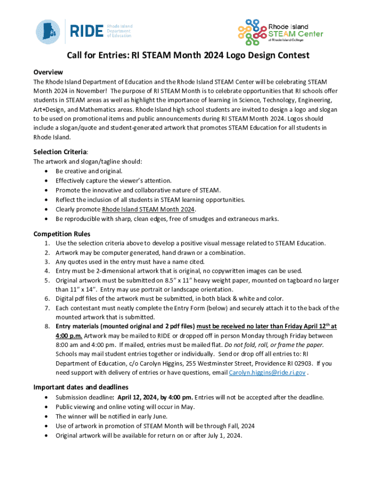 Call for Entries: RI STEAM Month 2024 Logo Design Contest Overview The Rhode Island Department of Education and the Rhode Island STEAM Center will be celebrating STEAM Month 2024 in November! The