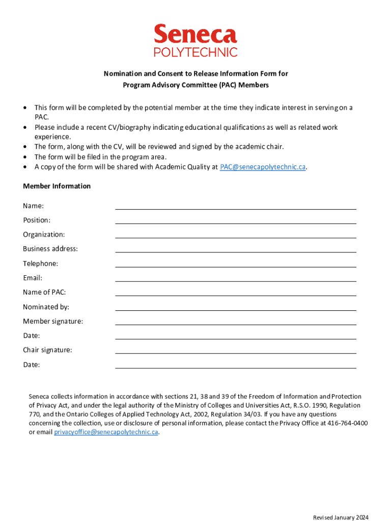 Nomination and Consent to Release Information Form for Program Advisory Committee (PAC) Members This form will be completed by the potential member at the time they indicate interest in serving on