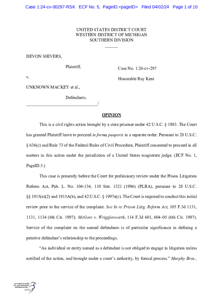 Case 1:24cv00297RSK ECF No. 5, PageID.pageID Filed 04/02/24 Page 1 of 10UNITED STATES DISTRICT COURT WESTERN DISTRICT OF MICHIGAN SOUTHERN DIVISION ___ DEVON SHIVERS, Plaintiff,Case No. 1:24cv297v.Honorable