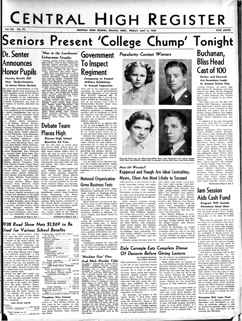 ( EN\"T RAL H 1G H REG I ST ER\' Se n,lors Prese.nt \'ColI\'ege Chump\' Tonight .Vol. LU.CENTRAL HIGH SCI;IOOL, OMAHA, NEBR., FRIDAY, MAY 6, 1938..Dr. Senter. nnounces Honor Pupils\'Man in the\' Lunchroom\'