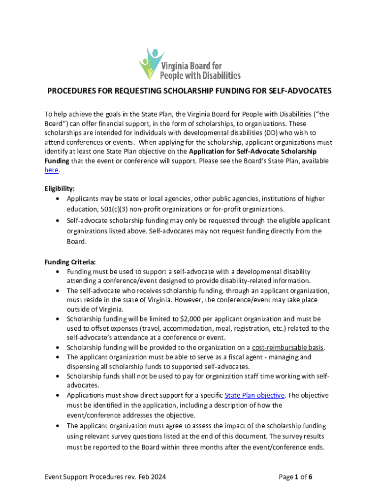 PROCEDURES FOR REQUESTING SCHOLARSHIP FUNDING FOR SELFADVOCATES To help achieve the goals in the State Plan, the Virginia Board for People with Disabilities (the Board) can offer financial support,