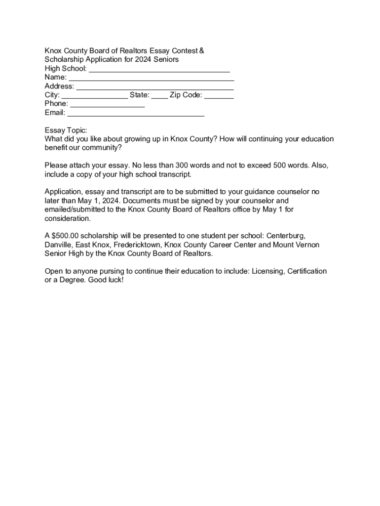Knox County Board of Realtors Essay Contest & Scholarship Application for 2024 Seniors High School: ___ Name: ___ Address: ___ City: ___ State: ___ Zip Code: ___ Phone: ___ Email: ___ Essay Topic: