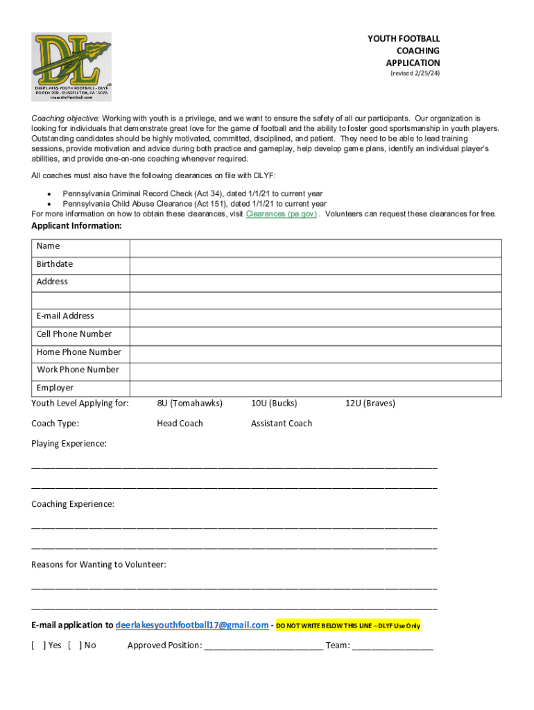 YOUTH FOOTBALL COACHING APPLICATION(revised 2/25/24)Coaching objective: Working with youth is a privilege, and we want to ensure the safety of all our participants. Our organization is looking for