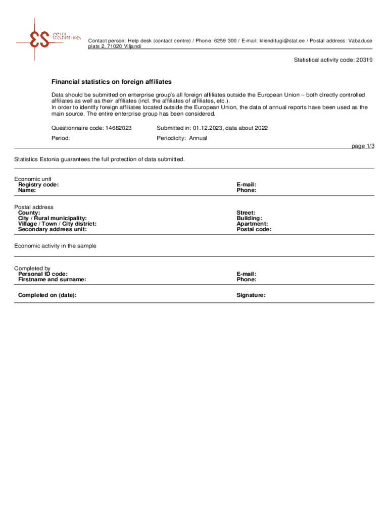 Contact person: Help desk (contact centre) / Phone: 6259 300 / Email: klienditugi@stat.ee / Postal address: Vabaduse plats 2, 71020 ViljandiStatistical activity code: 20319Financial statistics on