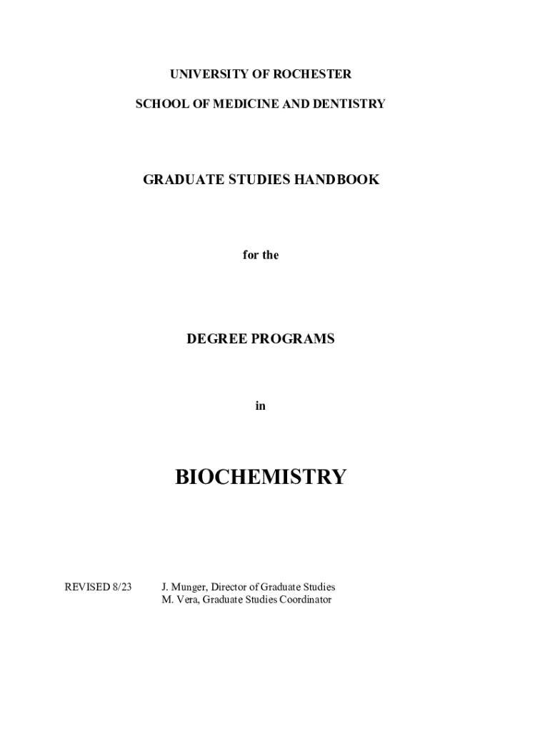 UNIVERSITY OF ROCHESTER SCHOOL OF MEDICINE AND DENTISTRYGRADUATE STUDIES HANDBOOKfor theDEGREE PROGRAMSinBIOCHEMISTRYREVISED 8/23J. Munger, Director of Graduate Studies M. Vera, Graduate Studies CoordinatorPREFACE