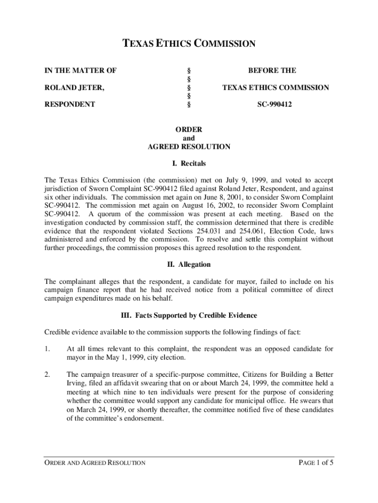TEXAS ETHICS COMMISSION IN THE MATTER OF ROLAND JETER, RESPONDENTBEFORE THE TEXAS ETHICS COMMISSION SC990412ORDER and AGREED RESOLUTION I. Recitals The Texas Ethics Commission (the commission) met